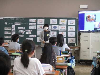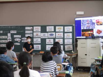外国語では,パフォーマンスチャレンジに取り組みました。ALTのクリスタ先生に日本や京都のことを英語で紹介するために,資料を作成したり,英語の表現の練習をしたりして準備をしてきました。本番は緊張していましたが,クリスタ先生に日本や京都の行事や食べ物のことを英語でしっかり伝えることができました。