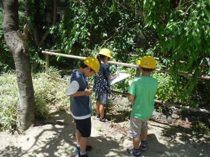 生活科「なつだとびだそう」の学習で,夏見つけに行きました。「話してみたい木」や「面白い形の葉」など,運動場で探しに行きました。