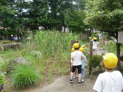 晴れている日にはない水たまりや水滴、ビオトープの蓮の葉やれんげなどしっかりと観察をして、雨の日の様子をプリントに書きました。