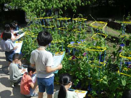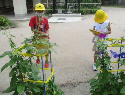 生活科「さかせたいなわたしのはな」の学習で育てているアサガオがたくさん咲き始めました。今回は、その花の観察をしました。以前に国語科で学習した視点(におい・おおきさ・かず・触った感じ)など、五感を使って観察することができました。