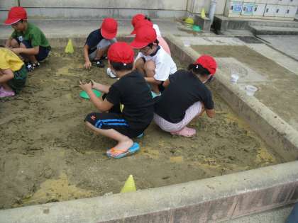 図画工作科「すなやつちとなかよし」の学習で、運動場の砂場で活動しました。手で砂を触って団子を作ったり、カップなどを使って立体的な作品を作ったりしました。砂の手触りを楽しみながら、活動に取り組むことができました。