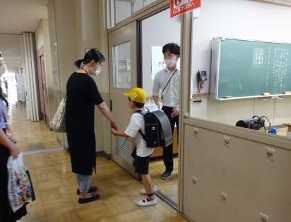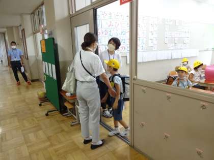 京都市の小学校では、児童在校中に震度5弱以上の地震や特別警報の発令された災害時には、児童を学校にとどめおくこととし、保護者にお迎えをいただいて、一緒に下校していただくこととしています。そのような事態を想定した「引き渡し訓練」を、1日の参観日に併せて実施しました。従来全学年で実施しておりましたが、コロナ禍のため、1年生のみの実施としました。