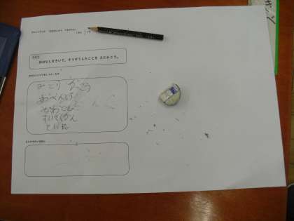 まずは、話を聞いて「でてきたもの・ひと」を書きだし、最後に「絵に表したい場面」を決め、下書きをしました。次回は、本番の画用紙に書いていく予定です。