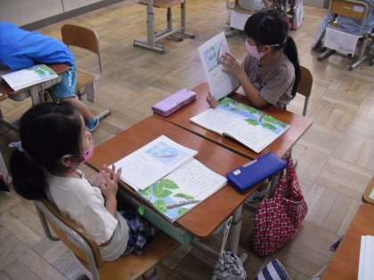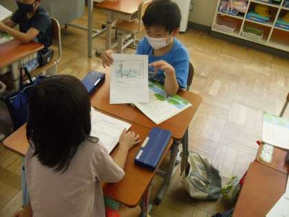 国語科「やくそく」の学習で、作成した「大好きカード」の交流をしました。大好きなところやわけ、その場面の絵などを丁寧にまとめ、発表することができいました。