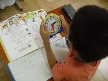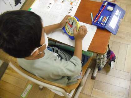 算数科「なんじなんじはん」の学習では、時計の読み方を考えました。長い針が12のところにあったら「〇時」、6のところだと「〇時半」ということを学びました。実際に時計を動かしてみて、考えることができました。