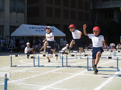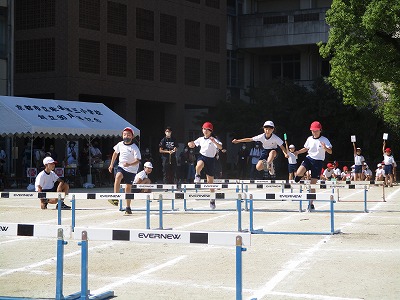 運動会では,初めに40mハードル走をしました。まっすぐ走るだけでなく,ハードルを飛び越えるのが難しくて,練習ではゆっくり走っていた子どもたちがいました。「トン・1・2・3」のリズムを何度も練習したり,できるだけ低く飛ぶ姿勢を練習したりしました。本番では,前を向いてどんどんハードルを飛び越えていく姿がとても力強く感じられた4年生でした。
