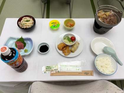 食事係の「いただきます」のあいさつで、夕ご飯をいただきます。みんな静かに食べています。おうどんとご飯はおかわりができるそうです。