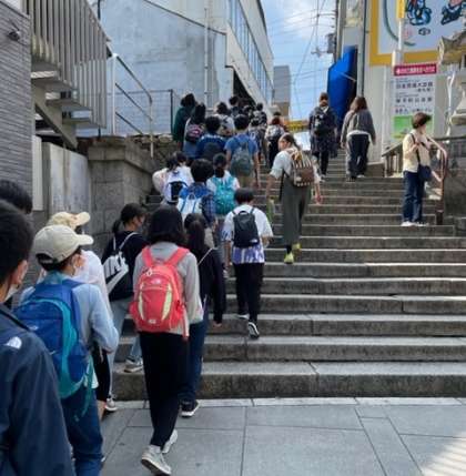 うどん作り体験のあとは、金刀比羅宮を見学しました。みんなで大門の鳥居のところまでのぼり、学年写真を撮りました。