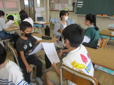 練習した表現をつかって、実際にインタビューに行きます。子どもたちは、しっかりインタビューができるように一生懸命練習していました。