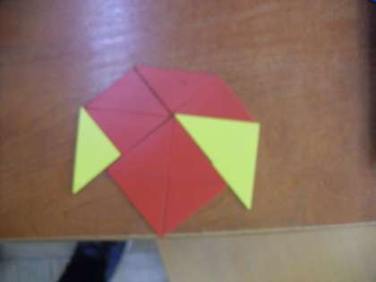 まずは、三角形の色板を使って形作りをしました。教科書に載っている形を、よく見て形を作りました。そのあと、それぞれ好きな形を作りました。楽しみながら活動することができました。