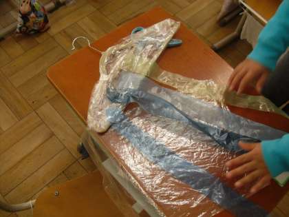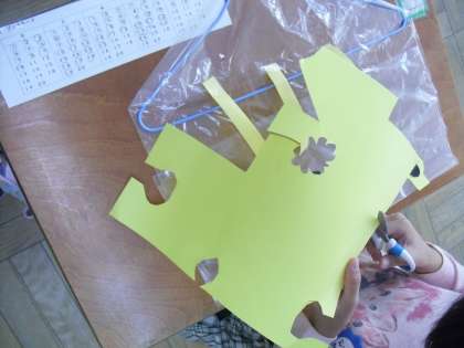 図画工作科「ひらひらゆれて」の学習では、ハンガーに袋やスズランテープ、紙テープなどを付けて、揺れると楽しい飾りを作っています。どんな飾りができるのか、楽しみです!
