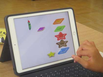 今日は、はらぺこあおむしの学習アプリ「いろとかたち」を使って、形合せの学習をしました。