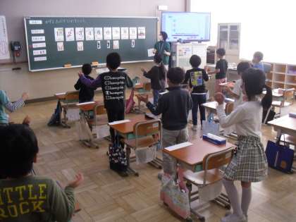 英語活動では、英語を使った簡単なあいさつや、数字の数え方を学んでいます。