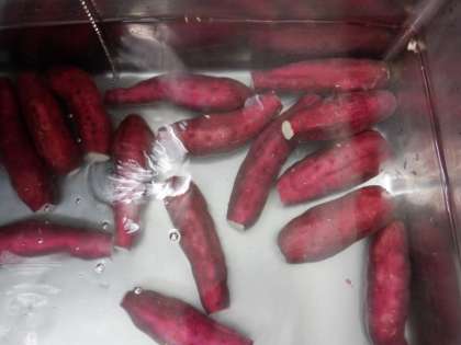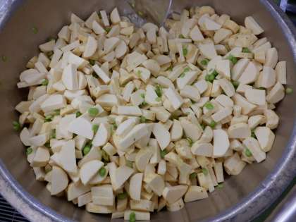 さつまいもの栂尾煮は、京都市右京区の栂尾という地域にある高山寺で生まれた料理で、さつまいもとえだ豆をあまく煮たものです。今日はスチームコンベクションオーブンを使って作りました。さつまいもの黄色とえだ豆の黄緑色が、秋の紅葉をイメージさせる彩りとなっています。