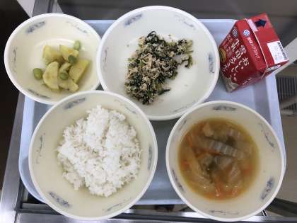11月4日の給食は「ごはん・牛乳・とりとだいこん葉のまぜごはん(具)・さつまいもの栂尾煮・はくさいの吉野汁」でした。