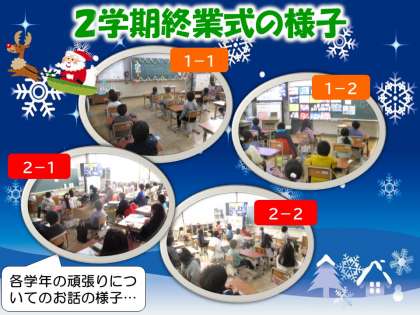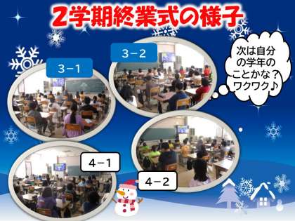 校長先生からは、2学期に行った行事や取組を通して、各学年が頑張っていた様子についてのお話がありました。2学期は、1年間の中でも大きな行事である運動会と学習発表会を行いました。子どもたちは、自分の力を出せるように頑張り、自分1人では難しいこともみんなで協力しました。この頑張った成果を、さらに次の成長へと活かしていけるよう、3学期も『前進・挑戦』していきます。明日からの冬休みの期間、各ご家庭で過ごす子どもたちの様子をよく見ていただき、よりよい3学期のスタートが切れますように、よろしくお願いいたします。