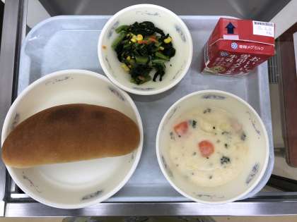 初日の11日の献立は「ミルクコッペパン・牛乳・じゃがいものクリームシチュー・小松菜のソテー」です。温かいクリームシチューは、寒い季節にぴったりです。パセリを加えて色合いよく仕上げました。