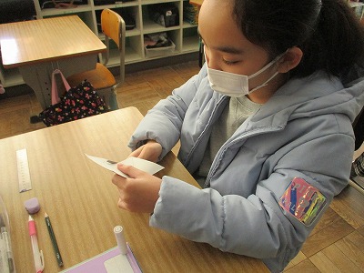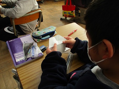 まずは、折り紙で正六角形を作りました。実際に作ったり、見たりすると図形の特徴がよく分かるようです。折り紙で作った後は、ノートにコンパスや三角定規、分度器を使って、正六角形をかきました。