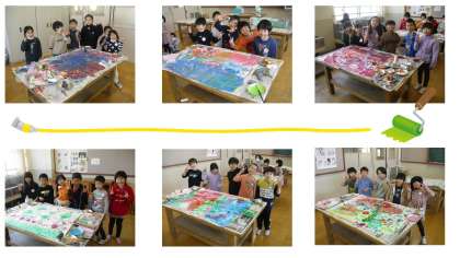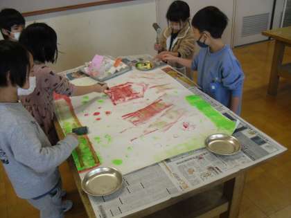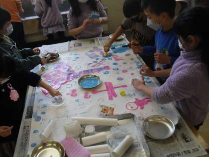 図画工作科「ぺったんコロコロ」の学習では、ローラーをしたり、カップなどを使って、大きな模造紙にスタンプを押したりしました。