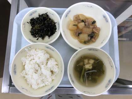 メニューは「ごはん・あまから鶏だいこん・小松菜とひじきのいためもの・花菜のすまし汁」でした。中でも「あまから鶏だいこん」は新献立です。鶏肉と冬が旬の大根や九条ねぎをあまからい味付けで煮こみ、最後に片栗粉を加えてとろみをつけて仕上げます。ごはんにとても合う献立で、子どもたちからも「おいしい!」という声が聞こえてきました。