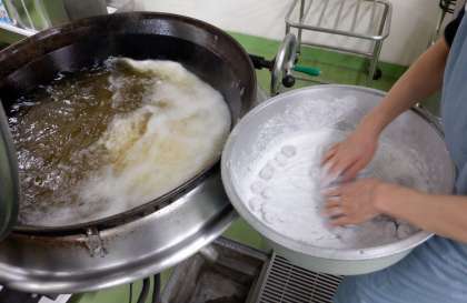 揚げ里いものあんかけは、里いもを昆布だし・みりん・しょうゆで煮てから、米粉をまぶし、油で揚げます。教室で揚げ里いものにそぼろあんをかけていただきます。そぼろあんも、かつおぶしのだしでつくった手作りのあんです。