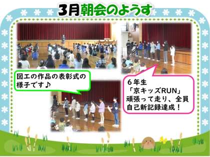 校長先生からは、まず、今朝、自分から気持ちのよい挨拶ができた子の話がありました。朱三校では、計画委員会のあいさつ運動の成果もあり、あいさつの意識の向上が少しずつ見られてきました。校長先生のお話のように、自分からあいさつのできる子どもがさらに増えると嬉しいです。次に、101周年感謝の式のときに全校みんなで歌えた校歌や、学年末に向けての自分の目標の達成具合についてのお話がありました。最後は、2月の「京キッズRUN」で走った6年生の子どもたちの紹介と記念メダルの授与が行われ、全校みんなで頑張った成果を称えました。