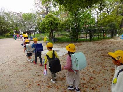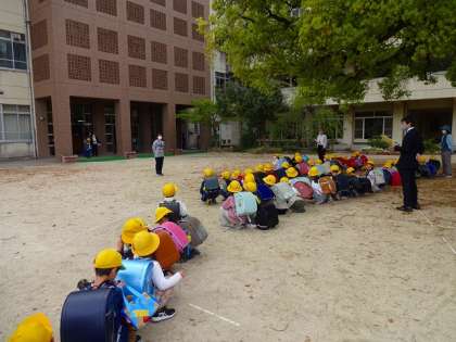 1年生の初めて下校の様子です。方面別にわかれて、教員の引率で集団で下校します。