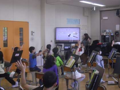 4年生の音楽は専科の先生が教えてくださいます。今年来られた先生だったので、まずはその先生を知るクイズに取り組み楽しそうに授業が始まりました。これから音やメロディーに合わせて楽しく活動してほしいです。