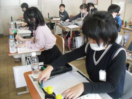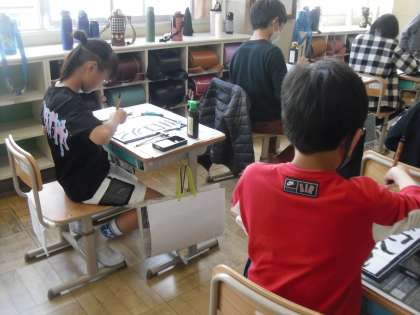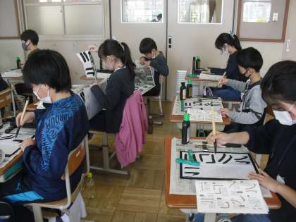 5校時には、書いた半紙をはさむ紙ばさみを作り、6校時には、点画の練習を行いました。