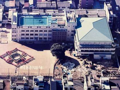 正門付近にあるビオトープ。校長室にある、平成13年(2001年)の80周年記念の写真を見ると、動物村と共に建設中の様子がわかります。今の校舎の建て替え工事が終わった後に、作り始めたのだと思います。
