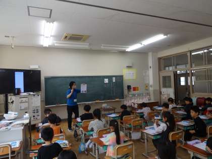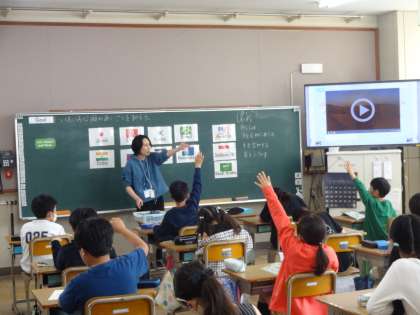 4年2組では、英語専科の代さき先生と外国語活動の学習をしていました。今年度最初の外国語活動の授業。今日はいろいろな国の挨拶について学んでいました。いろいろな国のことについて学び、視野を広げていってほしいと思います。