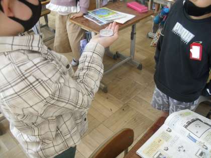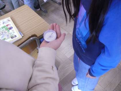 地図にまとめていくために、方位磁針を使って、北を見つける活動をしました。一生懸命取り組んでいました。