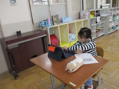 挿絵を見ながら、まちにはどんな建物や乗り物があるのか、どんな人がいるのかを見つけて発表しました。タブレットで拡大しながら細かいところまでよく見て発表していました。普段からよく知っている「スーパー」や「コンビニ」、あまり馴染みのなかった「市役所」や「ガソリンスタンド」などたくさん見つけることができました。それぞれどのような役割をしているところなのか、これから学習していきましょうね。