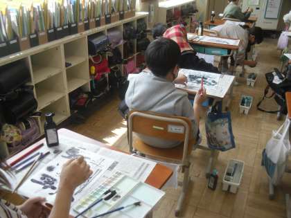 6年になってはじめての「図画工作」の学習をしました。墨を使ってどのように工夫して表現するのかを予想し、実際に半紙に表現してみました。水に広がる墨や、少しずつ濃淡をつけた美しさを楽しみました。