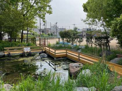 昨年秋から、児童だけでなく、地域の皆様、保護者の皆様にもお力を貸していただき、様々な修繕や整備を行っていたビオトープ。教育委員会にも支援していただきながら、昨年度末には、水を循環させる管の詰まり解消修繕や、水を循環させるための水中ポンプの更新も行いました。そして昨日、最後に残っていた、観察橋の改修が終わりました。これでとりあえず、ビオトープとしての姿に戻りました。今後細かい整備や草引き等のほか、活用に向けてのルールなどを整備し、学習の場として活用できるようにしていきたいと思います。