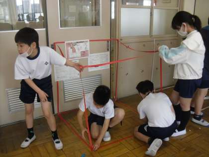 27日(木)の体積の学習では、班で協力し、1mの紙テープを使い1㎥の大きさを作りました。どうすれば作れるのか、試行錯誤しながら、力を合わせて作っていく姿が素晴らしかったです。1㎥の大きさに、みんなとても驚いていました。