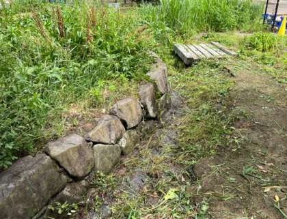 上の写真は5月30日の「ゴミ0ピカピカ大作戦」の後の写真です。この日は水路の草を抜いてもらいましたが、石垣の上の畑の草は全く手つかずでした。