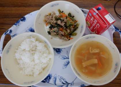 今日の給食は、「ごはん・牛乳・豚肉と小松菜の梅いため・キャベツのすまし汁」でした。