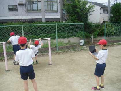 体育科「鉄棒」の学習では、いろいろな技に挑戦してきました。今日は、単元の最後の時間なので、出来るようになった技をタブレットで撮りあいました。うまくいったところを確認したり、もう少しでできそうな子供は、どこが惜しいのかを確認したりしていました。