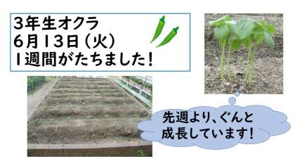 今週のオクラの様子です。今日から水やりスタートしました。先週より、ぐんぐん成長しています!!