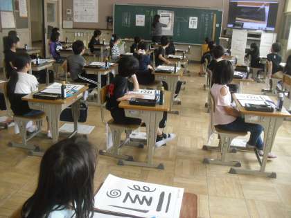 子どもたちは準備の仕方から書く時の注意、片付け方法までを確認し、習得していました。