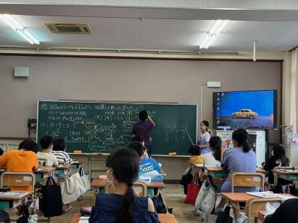 5時間目に5年2組をのぞくと、算数科の学習をしていました。小数の割り算について学習していましたが、発表する人がみんなの方を向いてしっかり発表できていました。