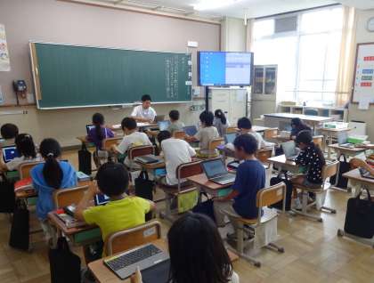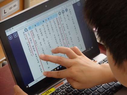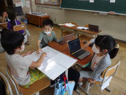 1時間目の2年2組では、国語科「スイミー」の学習をしていました。ロイロノートを使って、出来事や場面の様子がわかる言葉に線を引き、それをもとにスイミーが元気を取り戻したことについてグループで考えました。