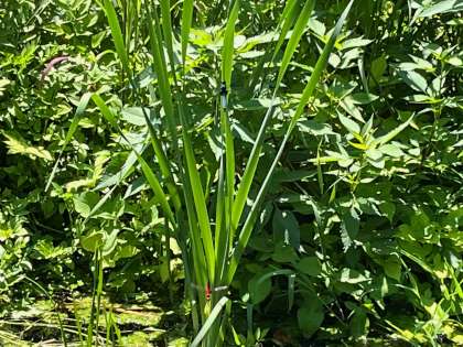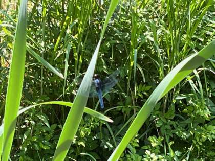 掃除時間に、5年生の児童とビオトープの草引きをしていると、昨日もいたアカトンボ?がまたやってきました。そしてしばらくすると、青いシオカラトンボ?もやってくるではありませんか!同じガマの上下に、シオカラトンボとアカトンボがとまっていました。着実に、生き物が集まる環境になってきているようです!