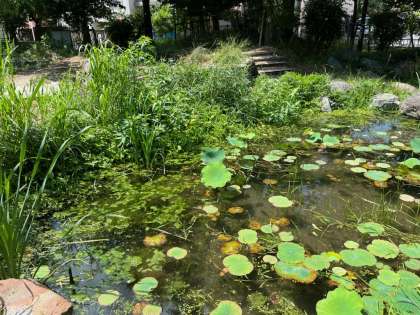 当初藻だらけだった池の中も、ハスやセリ、ヨシ、ガマなどが自生して、自浄作用があるそれらの植物のおかげか、藻がどんどん減り、水質が良くなってきているようです。太陽に照らされて水中がよく見えます。