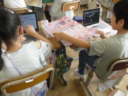 社会科「商店のはたらき」の学習では、スーパーマーケットの商品がどこから届けられているのかを調べました。いろいろなスーパーのチラシを見て産地を探し、地図帳で調べて地図に書き込みました。初めは、「日本のいろいろなところから届けられている」と予想していた子どもたちも、世界中から届けられていることに驚いていました。