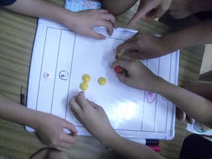 「エンドボール」の学習では、どうしたらもっと点が取れるか、もっとパスがつながるか、うまく守れるかなどを考えながら学習に取り組んでいます。学習時間にも作戦タイムはありますが、その時間では足りないくらい一生懸命話していたので、教室でも時間を取りました。