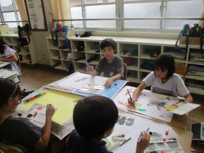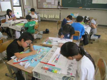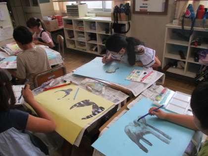 図画工作科では「言葉から形・色」の学習をしています。お話を聞いて、心に残った場面や心に残った言葉から想像を広げて絵に表していきます。慎重に描く子ども、楽しそうに笑顔で描く子どもと様々ですが、みんな一生懸命取り組んでいます。