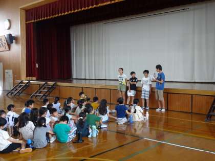 中間休み、体育館では、スポーツチャレンジ大会(大繩)の記録測定を、1年生がしていました。運動委員会の児童が進行してくれていました。