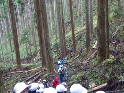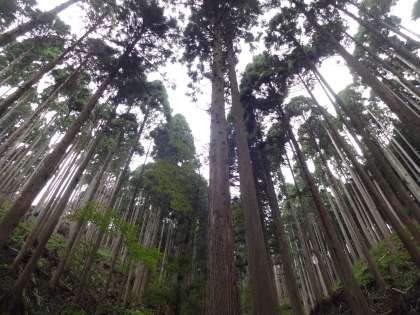 まっすぐにのびている木は人工的に植えた人工林で、これらの木は杉の木だとのことです。杉は針葉樹で、道中にたくさんありました。